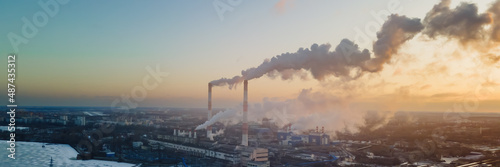 Fototapeta premium Industrial factory pollution, smokestack exhaust gases. Industry zone, thick smoke. Climate change and global warming. Wide banner
