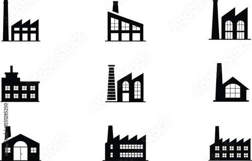 Fototapeta premium Industrial Factory Silhouette Icon Set Featuring Nine Distinct Black Shapes...