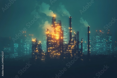 Obraz premium Industrial factory with smoke stacks emitting pollution into dark sky