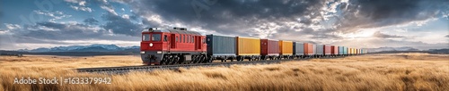 Naklejka premium Industrial Freight Train Transporting Containers Through Rural Landscape with...