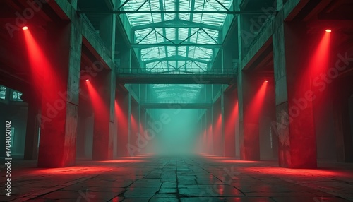 © miss irine, Fototapeta premium Industrial hall interior view with red lights. Grunge architecture design and concrete floor. Underground warehouse space for rave party or cyberpunk location with mystic fog and neon illumination.