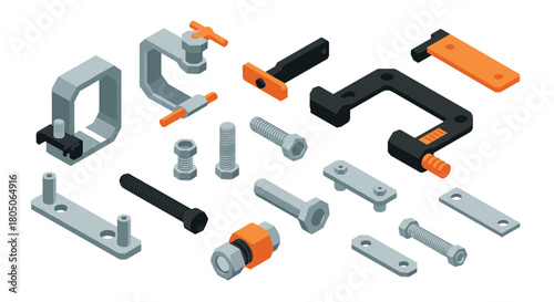 Obraz premium Industrial hardware collection: isometric tools and fasteners in gray and orange