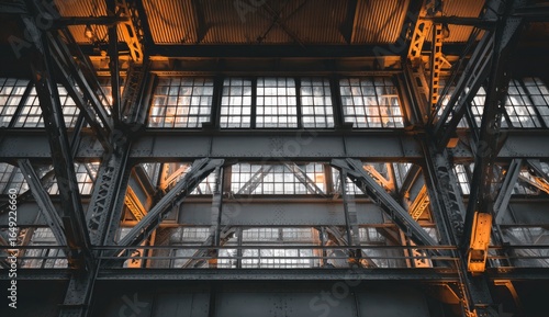 © Naufal, Obraz premium Industrial interior, low-angle view of a large metal building with support beams and rows of windows. Warm light filters through the windows, highlighting the structure