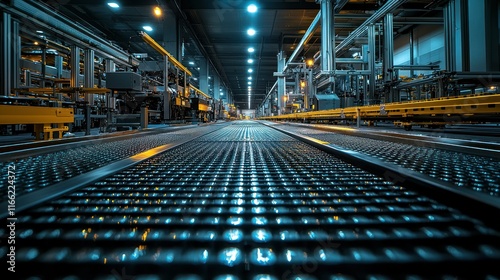 Naklejka premium Industrial interior with illuminated conveyor system.