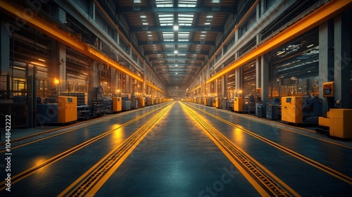 Fototapeta premium Industrial interior with machinery and illuminated pathways.