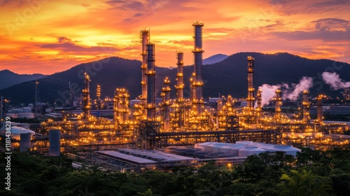 © Bakol, Fototapeta premium Industrial Landscape at Dusk with Reflected Lights on Oil Refinery Towers Against Vibrant Sky and Mountains in Background