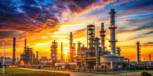© Nasnunt, Naklejka premium Industrial landscape at sunrise with oil refinery plant in industrial zone, surrounded by tall structures and machinery , industrial refinery, sunrise industrial