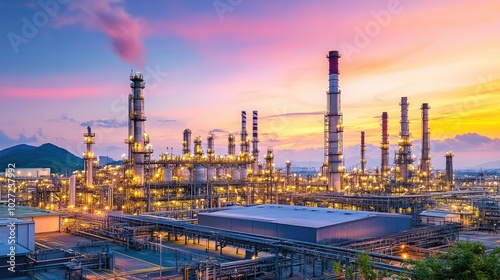 © Matcha_09, Fototapeta premium Industrial Landscape at Sunset with Colorful Sky