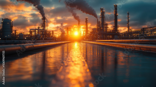 Fototapeta premium Industrial landscape at sunset with smokestacks and reflections