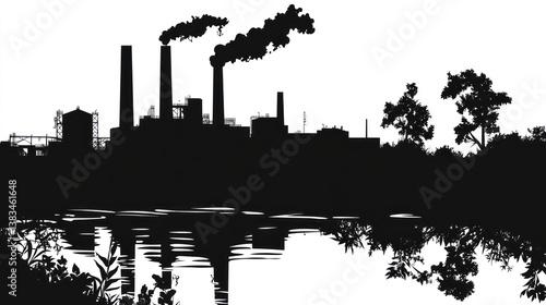 © Mundhut, Obraz premium Industrial landscape silhouette, factory by river, trees, smoke