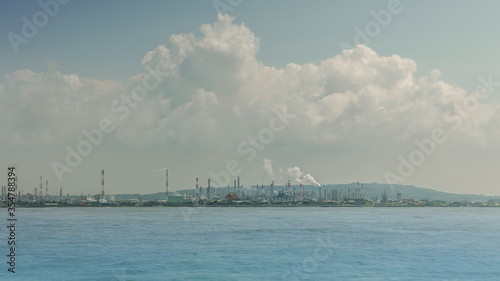 Naklejka premium Industrial landscape view from the ocean. Sea pollution and ecological problem
