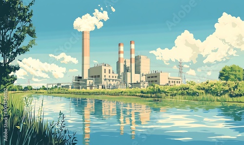© Pumapala, Obraz premium Industrial Landscape with a River and Blue Sky