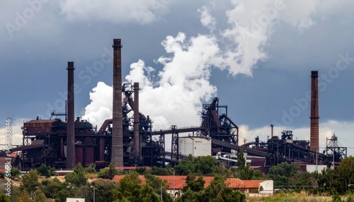 Fototapeta premium Industrial Landscape with Smokestacks and Dramatic Sky Overhead