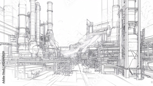 Obraz premium Industrial line drawing of a steel factory with molten metal pouring from furnaces, symbolizing heavy industry.