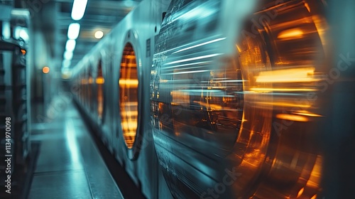 Fototapeta premium Industrial machinery, high-speed production line with glowing rollers.