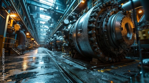 Fototapeta premium Industrial Machinery in a High-Tech Manufacturing Facility with Metallic Components and Illuminated Interior