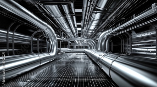 Naklejka premium Industrial Metallic Pipes Corridor Structure