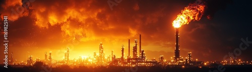 Fototapeta premium Industrial oil refinery blaze urban cityscape high-resolution image sunset environment dramatic viewpoint energy concept