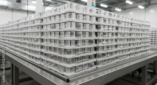 © Polina, Obraz premium Industrial packaging facility, stack of finished canned goods packed in trays, shrink-wrapped on metal platform in bright space
