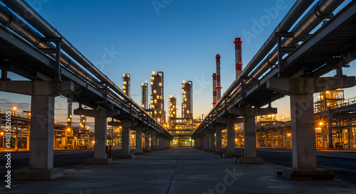 © abu, Naklejka premium Industrial Petrochemical Plant at Twilight with Blue Sky and Complex Pipeline Structure