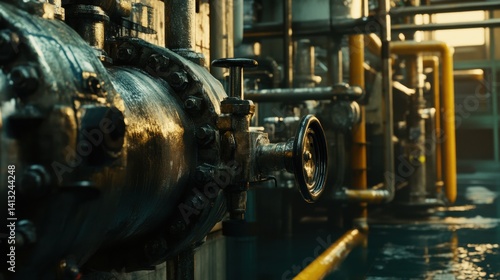 © NashEmpire, Fototapeta premium Industrial Pipe System in a Modern Facility with Reflections and Light