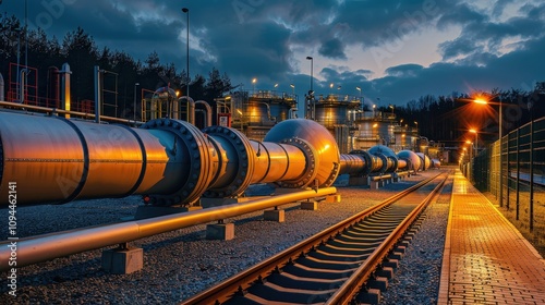 © S@photo, Naklejka premium Industrial Pipeline at Dusk with City Lights