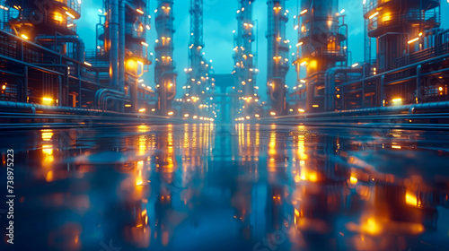 Fototapeta premium Industrial pipelines and valves in blue light of a petrochemical plant.....