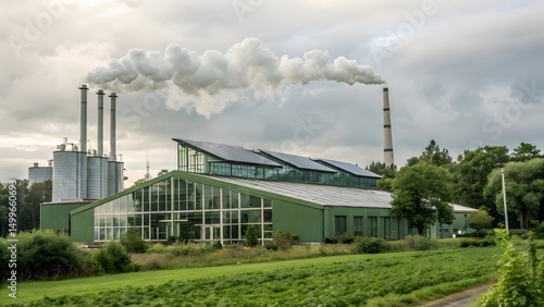 © Ragnar, Obraz premium Industrial Plant with Emission Stacks and Solar Panels