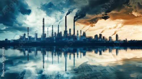 Fototapeta premium Industrial pollution impacting river ecosystem urban area photography dramatic skies wide angle environmental awareness