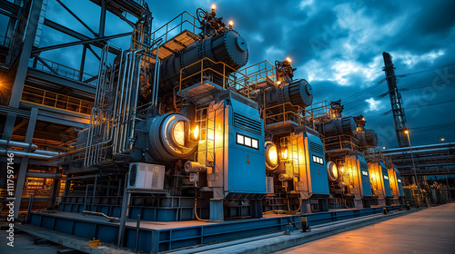 © skumer, Obraz premium Industrial power generators illuminated at dusk in a facility. Generative AI