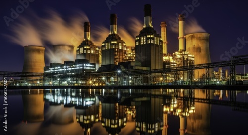 Naklejka premium Industrial Power Plant at Night: Majestic View with Glowing Towers, Trails,...