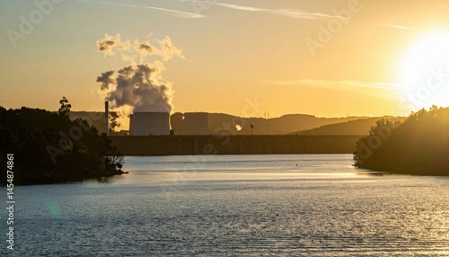 © Kitta Studio, Fototapeta premium Industrial Power Plant at Sunset with Reflections on Water Surface