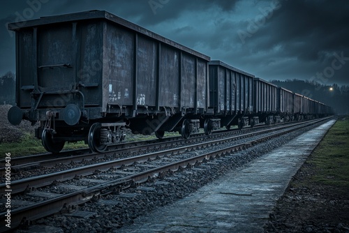 © Montaha Hossain, Fototapeta premium Industrial Railroad at Dusk: A Long Freight Train