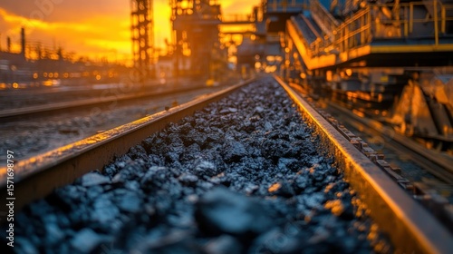 © Lemdah, Obraz premium Industrial railway tracks filled with dark stones at sunset