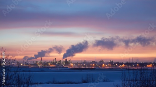 © dong, Fototapeta premium Industrial Refinery at Dusk with Illuminated Towers and Vapor Emissions