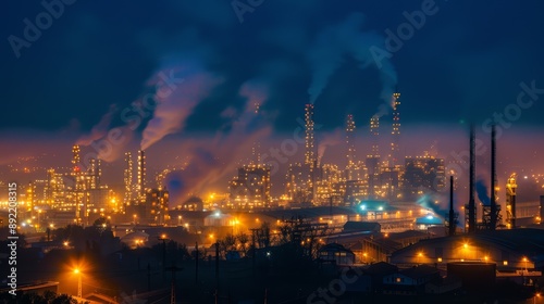 © Maria, Naklejka premium Industrial Refinery at Night with Smoke