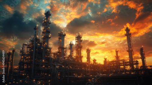 © Sunshine, Fototapeta premium Industrial Refinery at Sunset with Dramatic Sky and Vibrant Colors