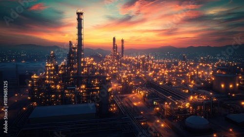 Obraz premium Industrial refinery at sunset with illuminated towers and vibrant sky