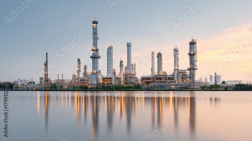 Fototapeta premium Industrial Refinery Landscape at Sunset with Reflections on Water, Showcasing...