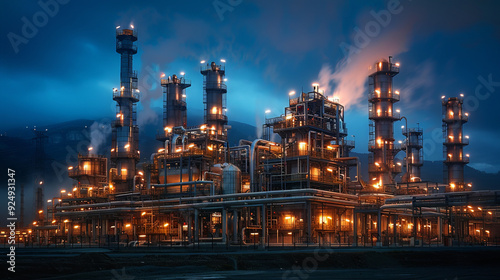 Fototapeta premium Industrial refinery with numerous chimneys bright lights night, emitting...