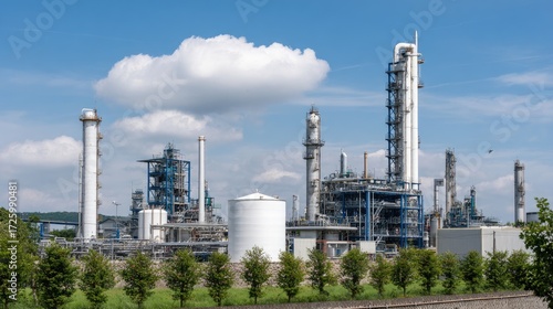 Obraz premium Industrial Refinery with Towers and Tanks Under Blue Sky