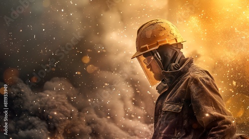 © Prasong Takham, Fototapeta premium Industrial Resilience: Oil and Gas Worker Amid Burning Iron in Golden Hour Light