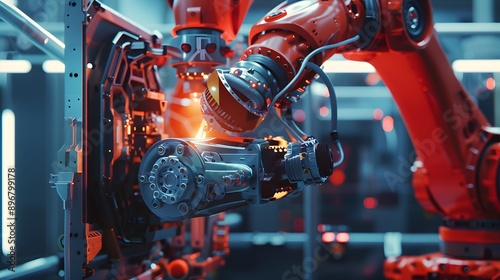 Fototapeta premium Industrial Robot Arm: A powerful industrial robot arm assembling car parts in an automated factory.