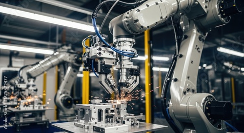 © Ning, Fototapeta premium Industrial Robots Welding Metal in Factory Setting