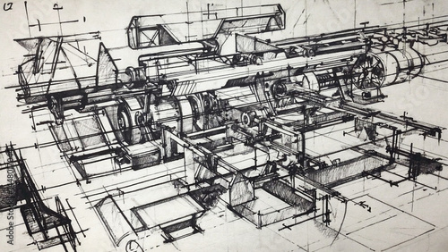 © Pasha, Obraz premium Industrial scene illustration of an old-fashioned factory in black and white
