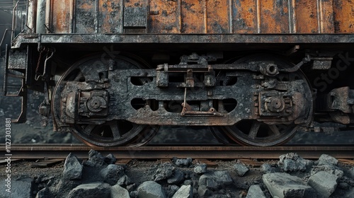 Naklejka premium Industrial scene of train wheels on tracks, coal-laden locomotive, detailed and raw, moving through the railroad
