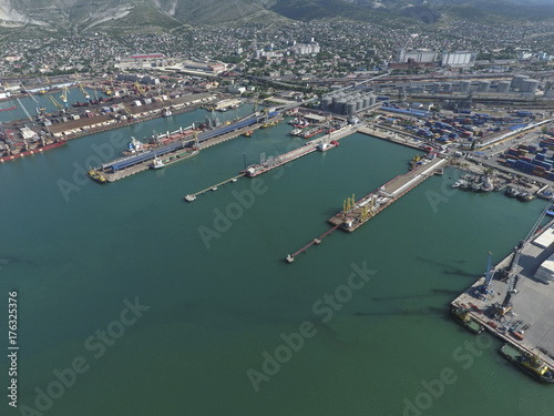 © eleonimages, Naklejka premium Industrial seaport, top view. Port cranes and cargo ships and ba