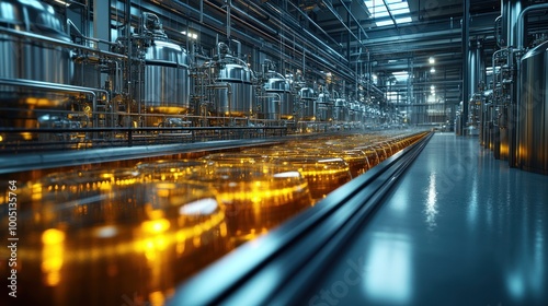 Fototapeta premium Industrial setting with illuminated bottles on a production line.