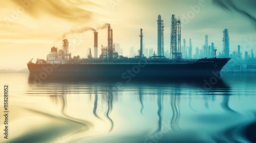 © Artittaya, Obraz premium Industrial Ship Silhouetted Against Sunrise with Smoke and Reflections