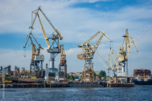 Fototapeta premium Industrial shipyard with numerous cranes along Saint Petersburg Neva River
